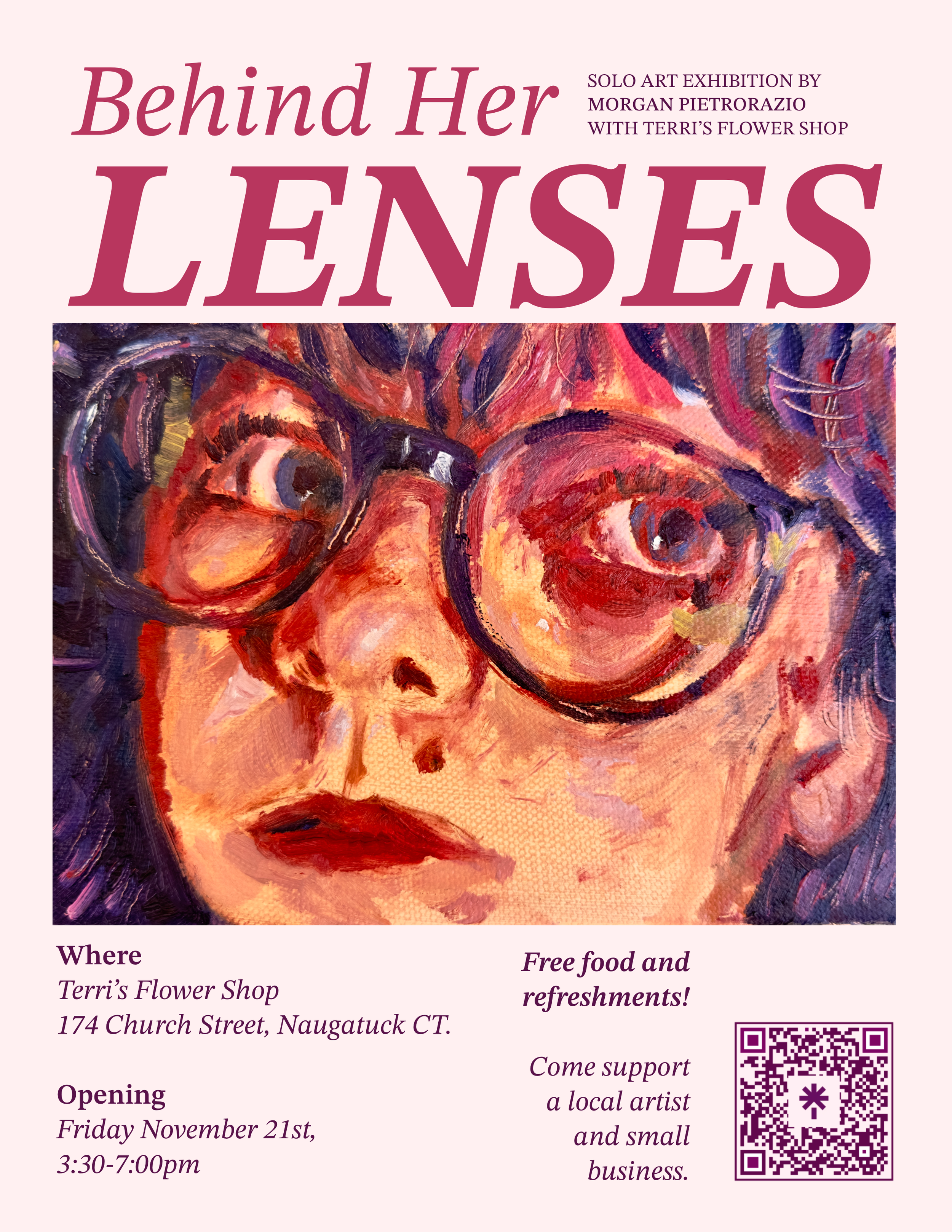 Behind Her Lenses is my upcoming solo show, installed in a space I redesigned with the help of my partner, Jesse, at Terri’s Flower Shop in Naugatuck, Connecticut.